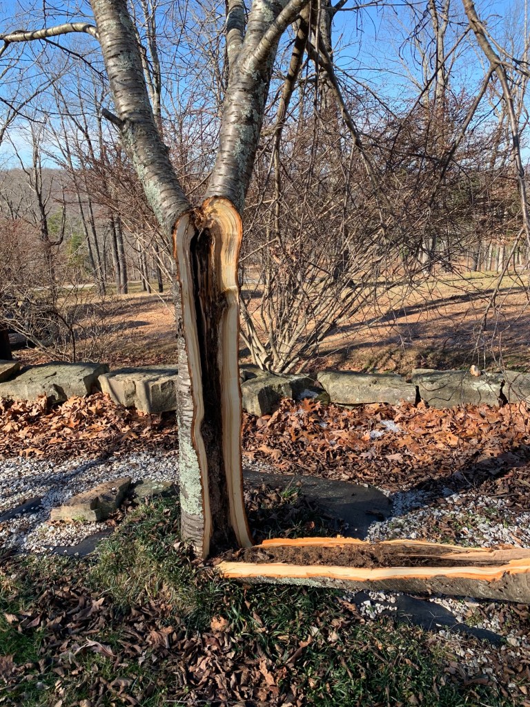 Last weekend, we had a light ice storm that weighed down the trees considerably. The ice was actually quite beautiful but I knew the potential for significant damage. I am grateful there was not more damage and hope we can correct some problems before another weather event. Since this is absolutely not the time of year I want to be pruning, I am vigorously developing a plan to address these problems as early as possible. Unfortunately, a cherry tree on our property completely split and we began the removal process; I wanted to share the photos and details so that you all might learn from this example.